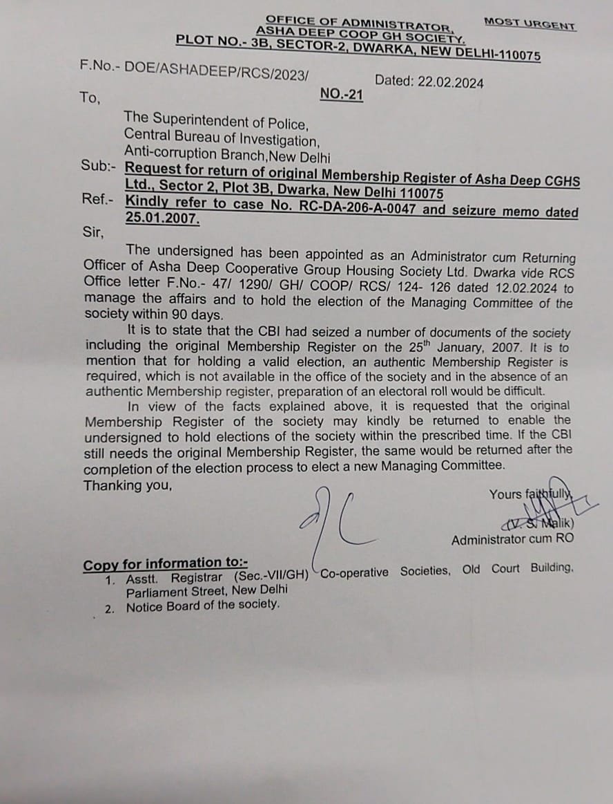 CBI Letter received for return of Original membership register